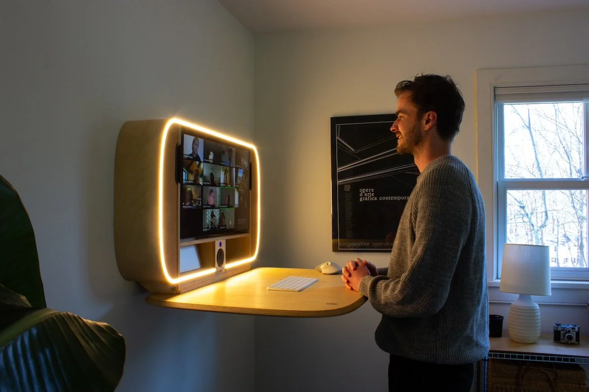 The Clamshell Desk’s ultra compact, wall-mounted frame efficiently organizes all of your tools and peripherals, and its hinged desk top and hidden monitor folds away at the end of the day to make it the best desk for small spaces.